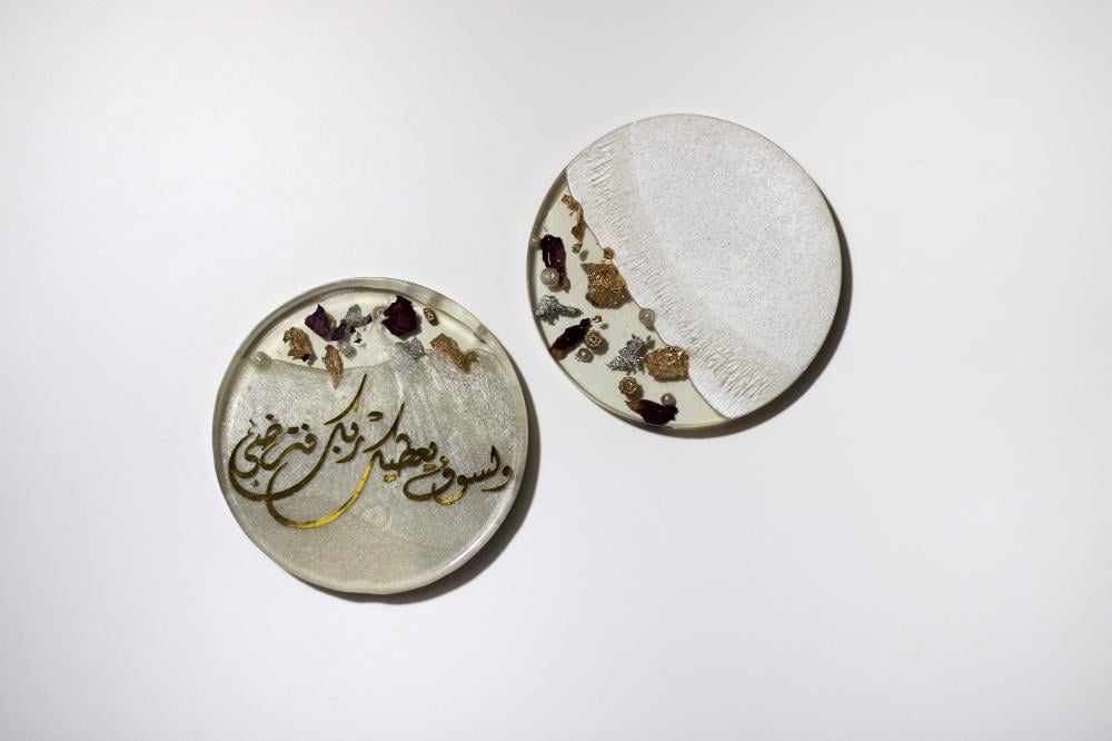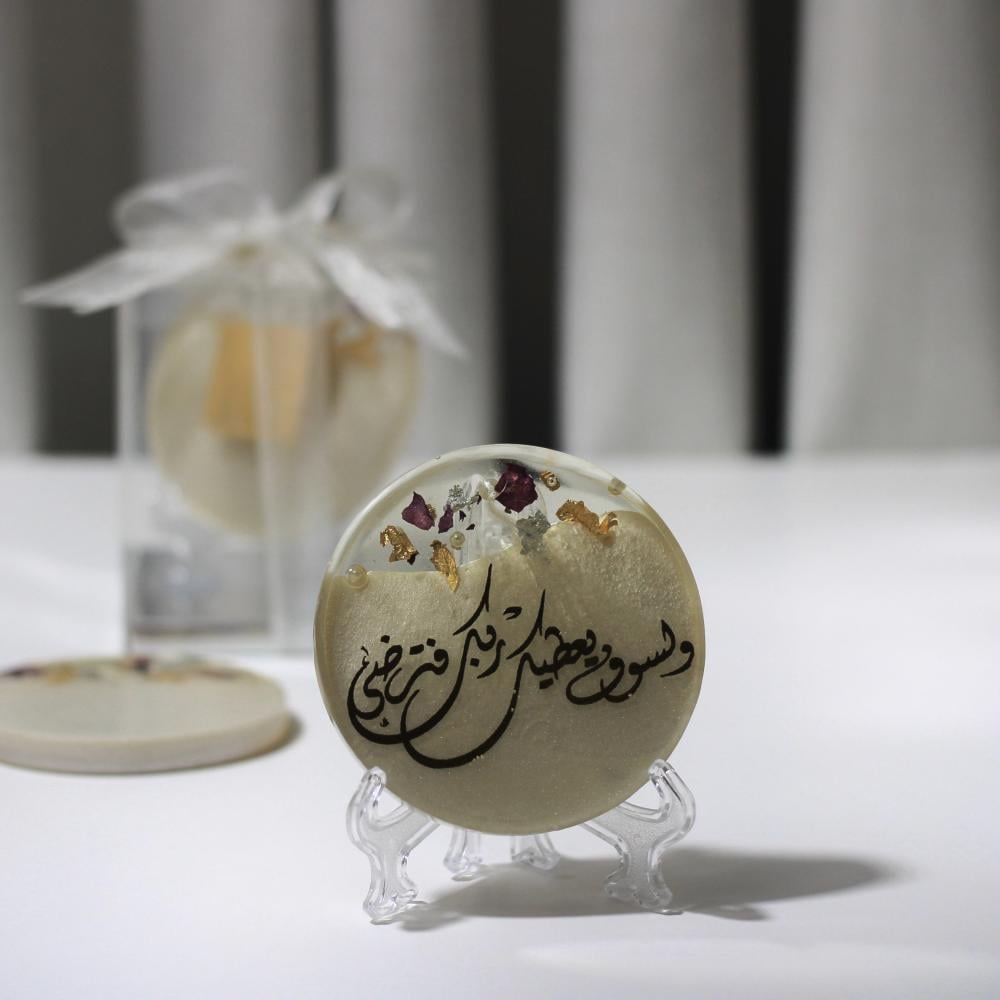 كوستر (قاعدة أكواب) أنيق مصنوع يدويًا من الريزين الفاخر، يتميز بتصميم فريد يدمج اللمعة الذهبية والفضية مع ورق الورد الجوري لإطلالة راقية.
